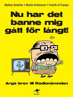 ”Nu har det banne mig gått för långt!” heter en bok om anmälningar till Radionämnden som jag läste portionsvis redan på manusstadiet (eftersom jag känner författarna Mattias Boström, Fredrik af Trampe och Martin Kristenson) och haft mycket nöje av. I morse var Trampe med i Gomorron Sverige och de hade plockat fram lite roliga klipp. Dessutom hade de ringt upp Lasse Åberg som fick kommentera att en tittare tyckte det var hädiskt att han kallades Julens konung (anspelning på Djurens konung) när det var Jesus som skulle vara i centrum av julen.