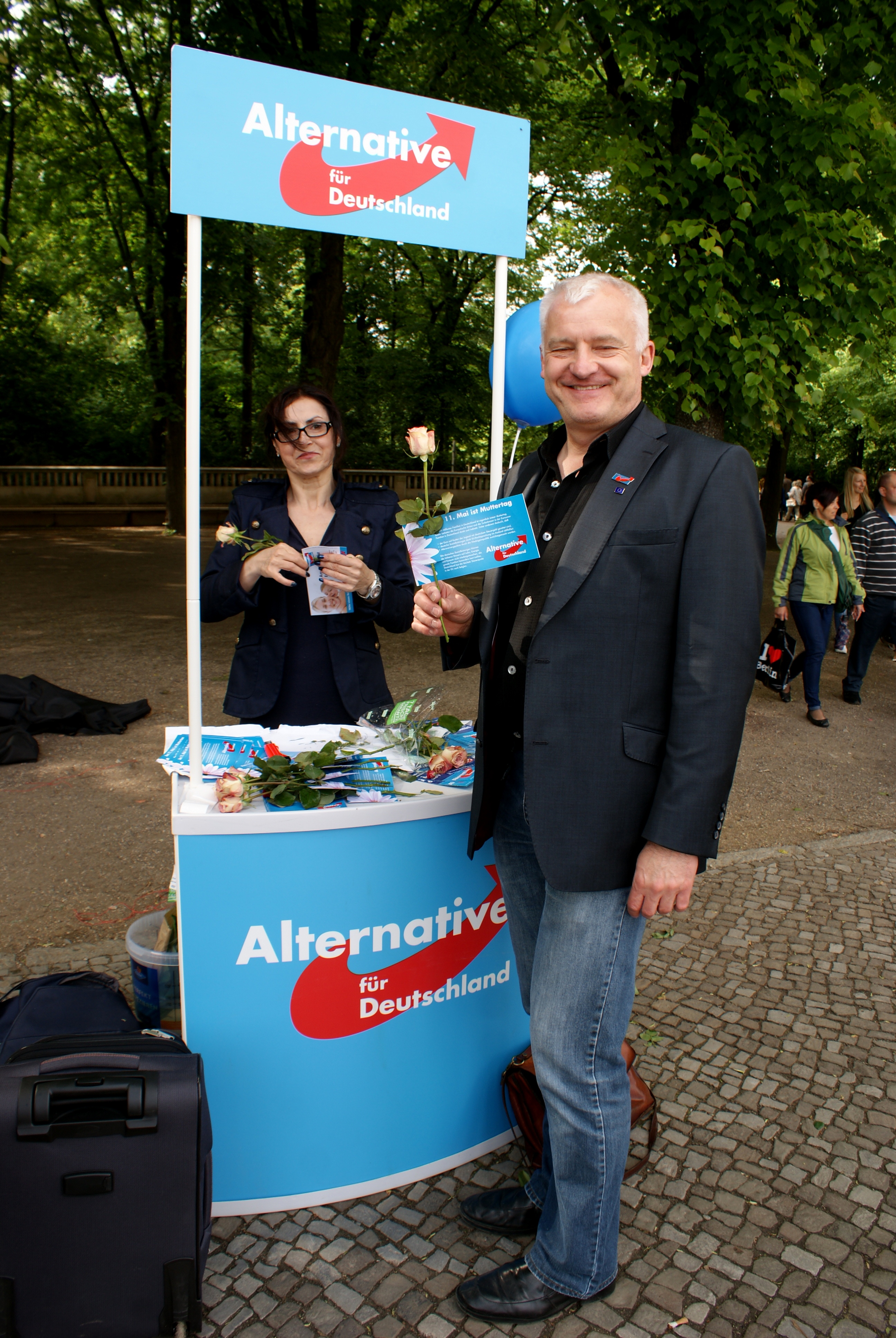 Alternative für Deutchland delar ut blommor på mors dag i Berlin strax före EU-valet 2014. Foto: Anna-Lena Lodenius