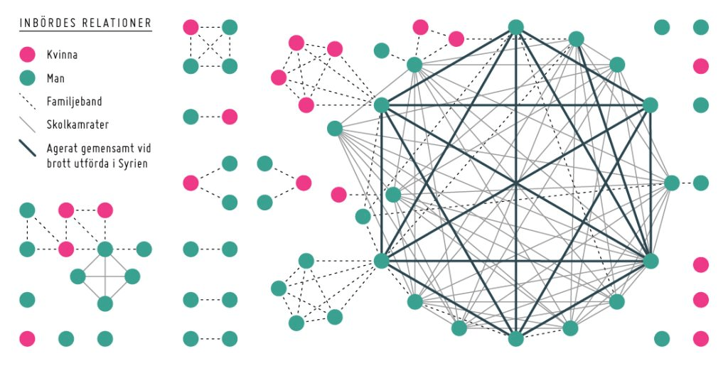 Min del var framför allt att ta fram ett underlag för sociogram och de visade att de som reste ofta ofta var familj eller släkt och att många hade gått i samma skolor. Just den delen av undersökningen visar på i hur hög grad radikalisering är en social process. Individen påverkas självklart av de som står närmast och i det här fallet har det fått vådliga följder. Många kom senare att begå fruktansvärda brott tillsammans. Som syns i sociogrammet finns ett kluster kring en skola (som jag kan avslöja ligger i Bergsjön) där många gått som senare agerade gemensamt i Syrien. Men som synes finns också andra små kluster och grupperingar av familjemedlemmar.